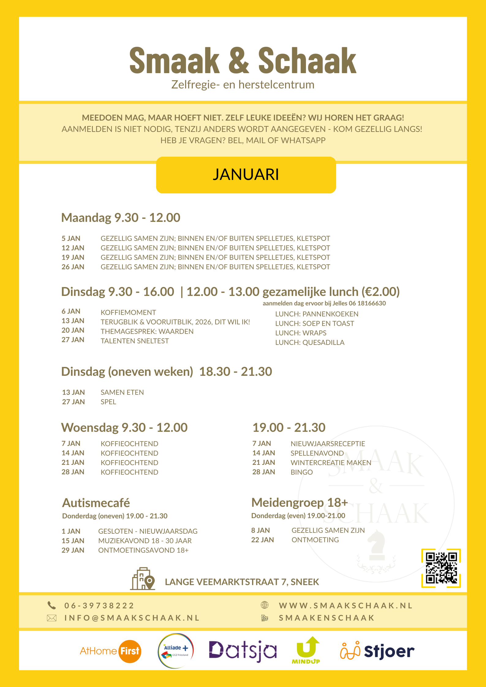 Binnen Smaak & Schaak worden er verschillende activiteiten georganiseerd. De activiteiten en trainingen die plaatsvinden zullen aangepast worden naar behoefte. Een aantal activiteiten zullen wat vaster zijn, denk bv. aan de ontmoetingsmomenten, maar de invulling kan per week verschillen. Zelf inbreng, wij horen het graag!
