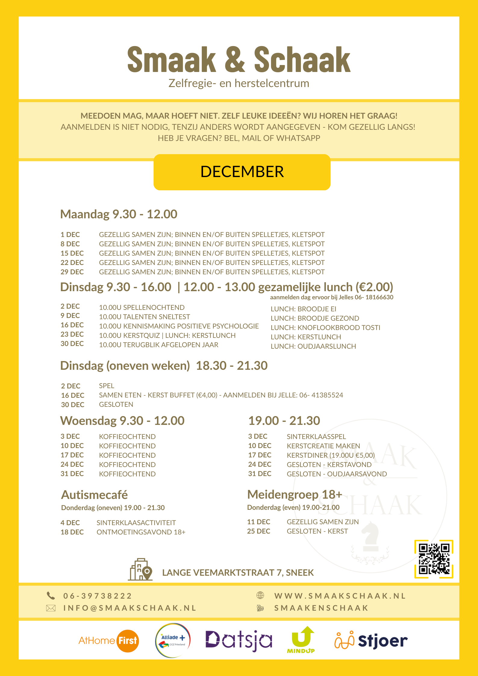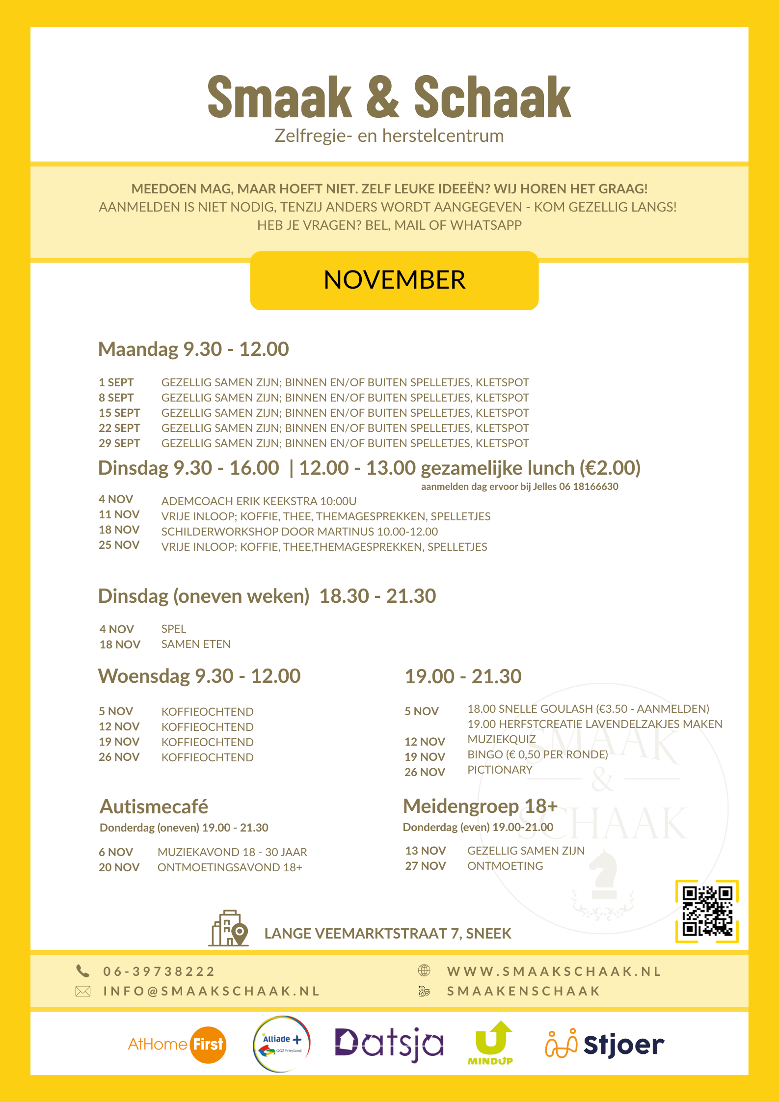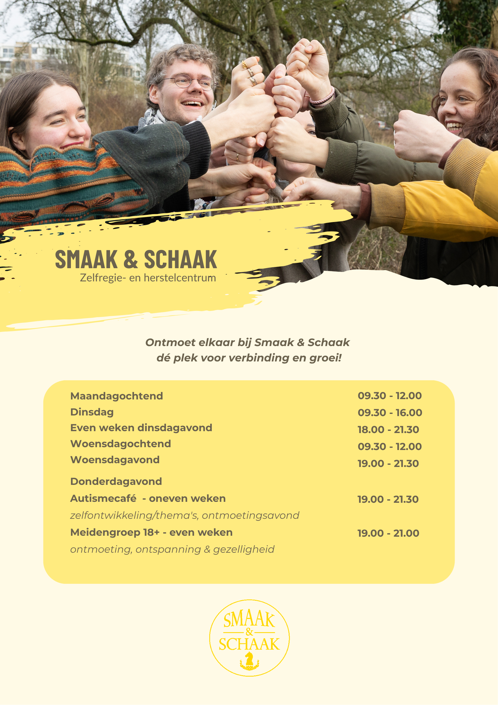 Binnen Smaak & Schaak worden er verschillende activiteiten georganiseerd. De activiteiten en trainingen die plaatsvinden zullen aangepast worden naar behoefte. Een aantal activiteiten zullen wat vaster zijn, denk bv. aan de ontmoetingsmomenten, maar de invulling kan per week verschillen. Zelf inbreng, wij horen het graag!
